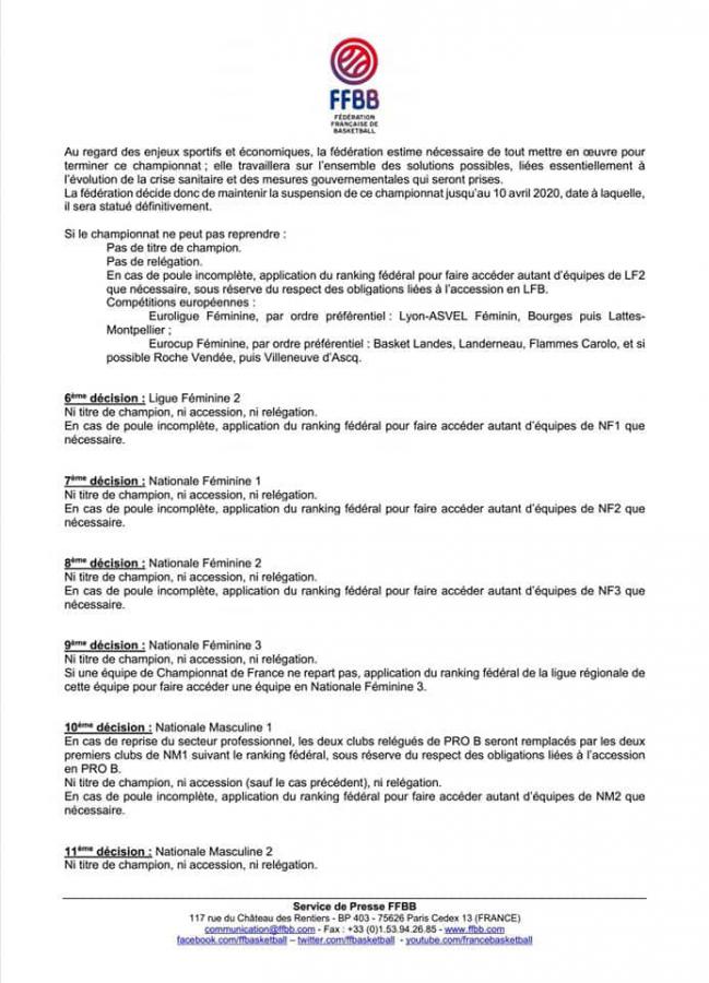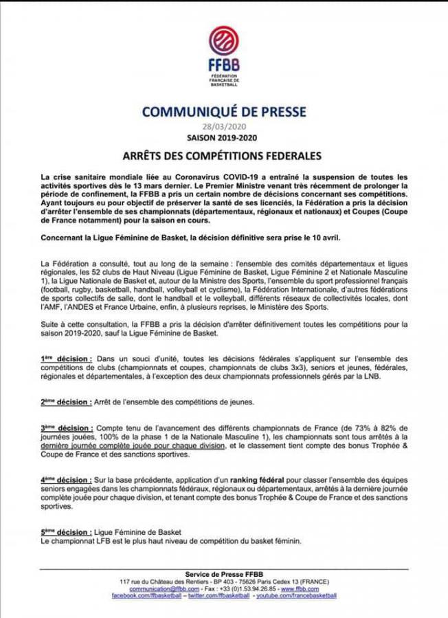 La FFBB a pris la décision d'arrêter l'ensemble de ses championnats (départementaux, régionaux et nationaux) et Coupes pour la saison en cours.